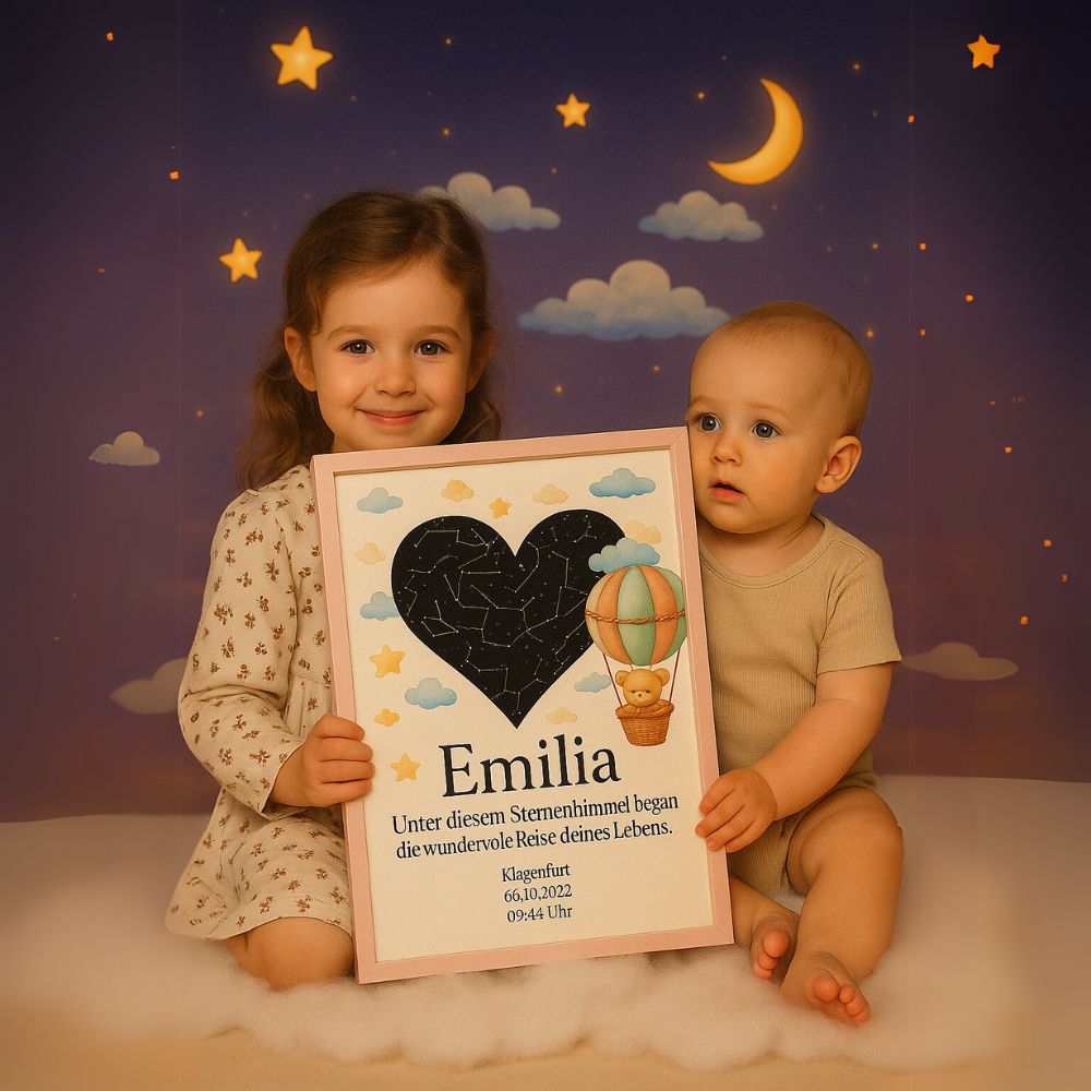 Unsere personalisierten Sternenkarten-Poster zeigen dir den Sternenhimmel eines ganz besonderen Augenblicks – ob zur Geburt, Taufe, Hochzeit oder als Erinnerung an einen magischen Tag. Mit Angaben zu Datum, Uhrzeit und Ort erstellen wir eine detailgetreue Sternenkarte, die durch ihre emotionale Bedeutung und ihr stilvolles Design begeistert.